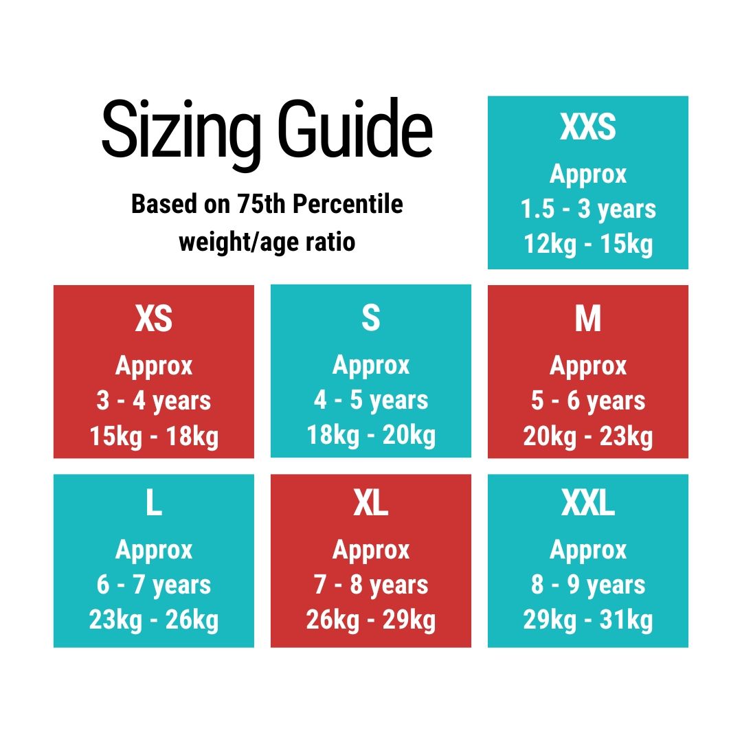When using the guide, it's good to consider your child's weight and body type. You need the undies to fit well around the legs to prevent leaks.